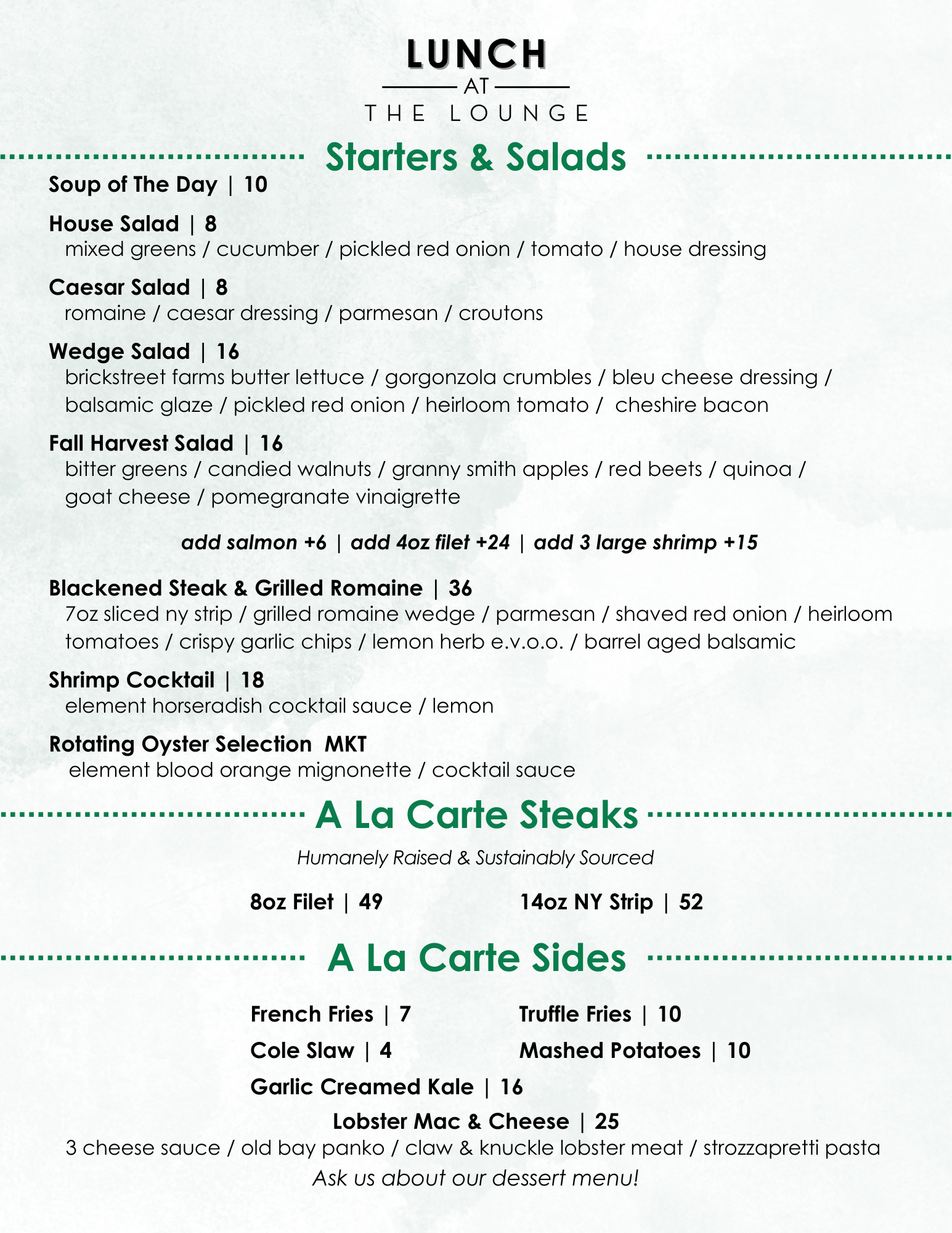 Enjoy a relaxed atmosphere, modern design, and dishes made to impress without the pretense. Whether you’re catching up with friends, treating a client, or savoring a solo moment, The Lounge at element is where Sarasota comes to lunch.